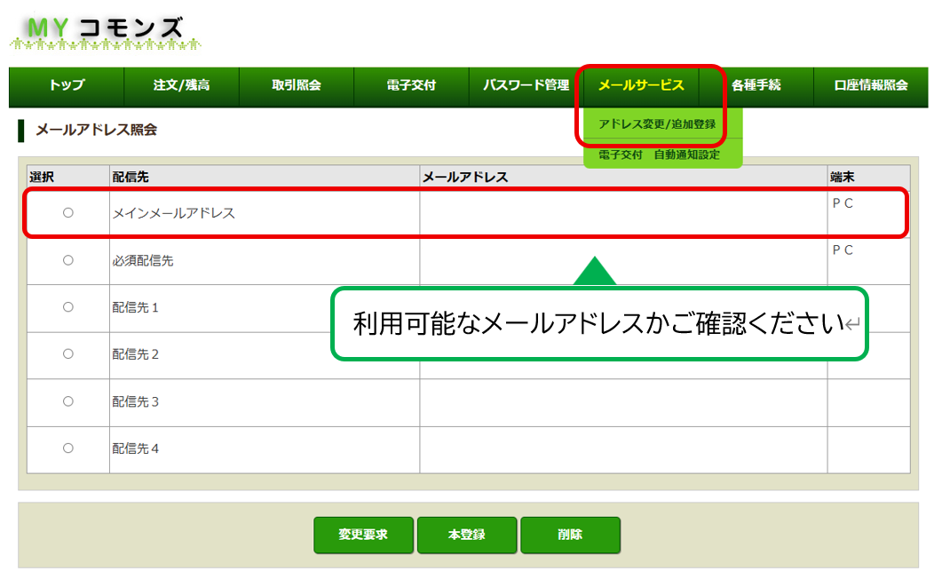 MYコモンズにログイン>メールサービス>アドレス変更/追加登録