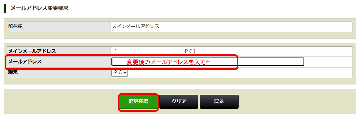(2) 変更予定のメールアドレスを入力して[変更確認]ボタンを押す