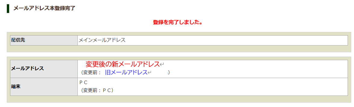 (4) 以下の画面が表示されたら、メールアドレス変更完了
